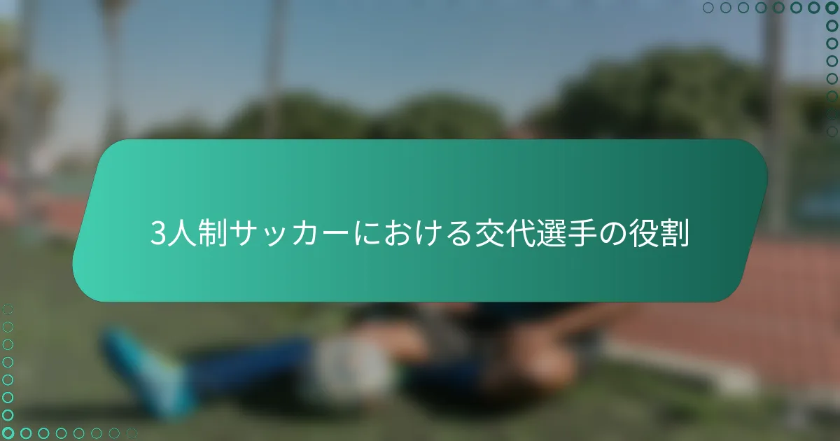 3人制サッカーにおける交代選手は、試合中にアクティブな選手を交代することができ、全体のダイナミクスや戦略に影響を与える選手です。彼らの役割は、選手の疲労や怪我を管理し、試合のテンポを維持するために重要です。